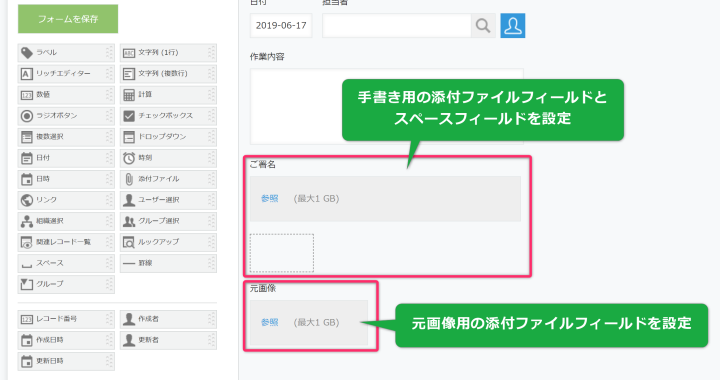 - プラグインを設定するアプリのフォームの編集をします。添付ファイルフィールド(手書き画像保存用)と、スペースフィールド(手書きを行うスペース)を設定します。