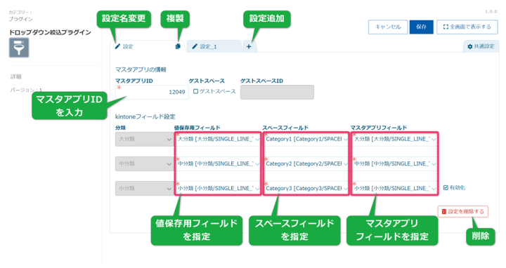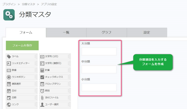 - プラグインを使用するために、「文字列(1行)」フィールドを設定し、絞り込み用の[分類マスタ]アプリを作成します。
