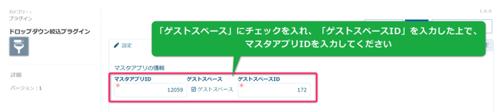 - ゲストスペース内のマスタアプリを使用する場合は、「ゲストスペース」にチェックを入れ、「ゲストスペースID」を入力した上で、マスタアプリIDを入力してください。