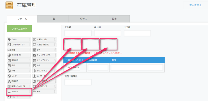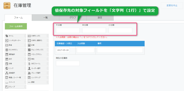 - プラグインを設定するアプリのフォームの編集をします。値保存先対象フィールドを「文字列(1行)」で設定します。