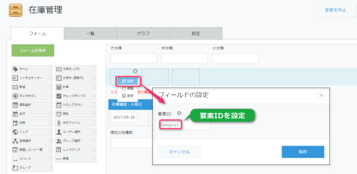 - 作成した各スペースに要素IDを設定します。設定を保存しアプリの作成を完了します。