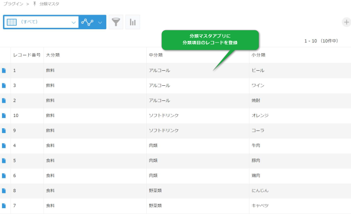 - 作成した[分類マスタ]アプリに、ドロップダウンとして利用するすべての絞り込みパターンをレコード登録します。