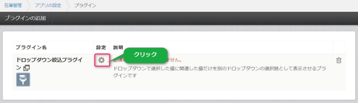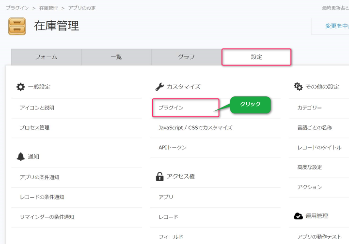 - アプリの設定画面の[設定]タブから「プラグイン」をクリックします。