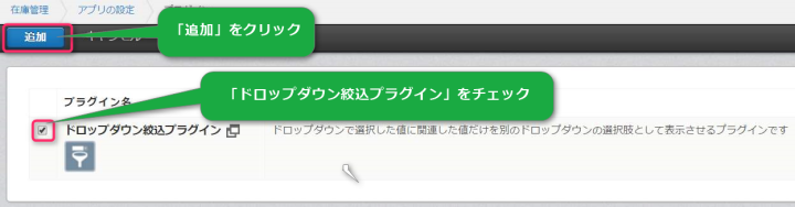 - あらかじめシステム管理で読み込んだ「プラグイン」一覧から「ドロップダウン絞り込みプラグイン」を追加します。