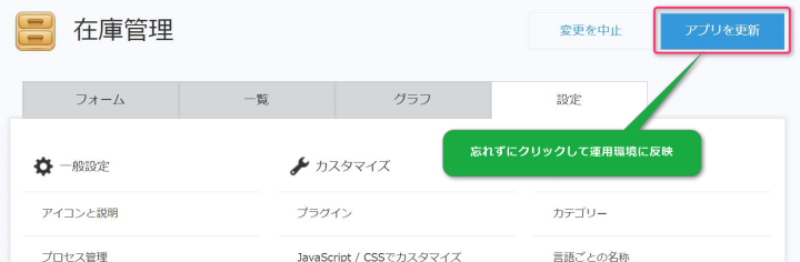 - プラグインの設定が完了したら、忘れずにアプリの設定を運用環境に適用します。