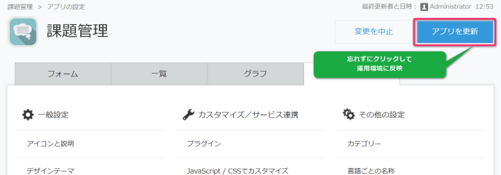 - プラグインの設定が完了したら、忘れずにアプリの設定を運用環境に適用します。