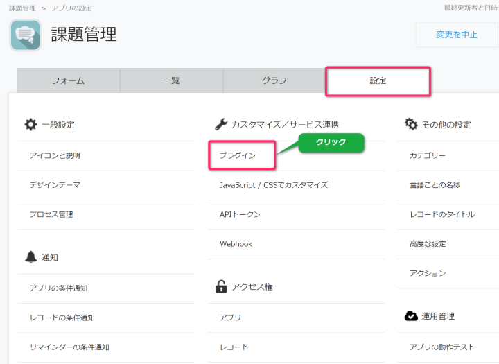 - プラグインを設定するアプリの[アプリの設定を変更する]をクリックします。