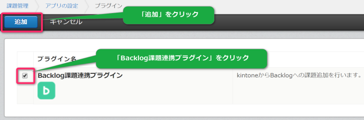 - 「プラグイン」一覧からBacklog課題連携プラグインを追加します。