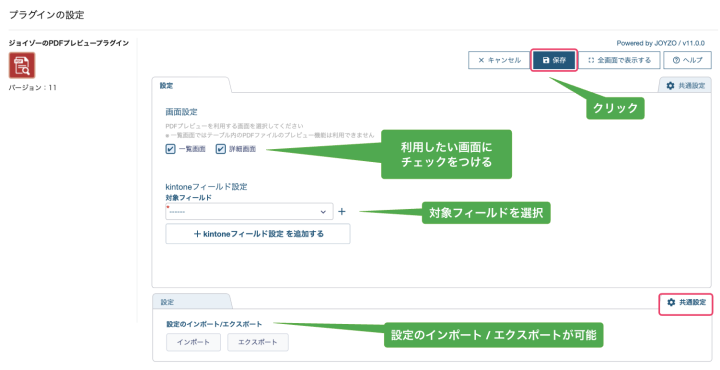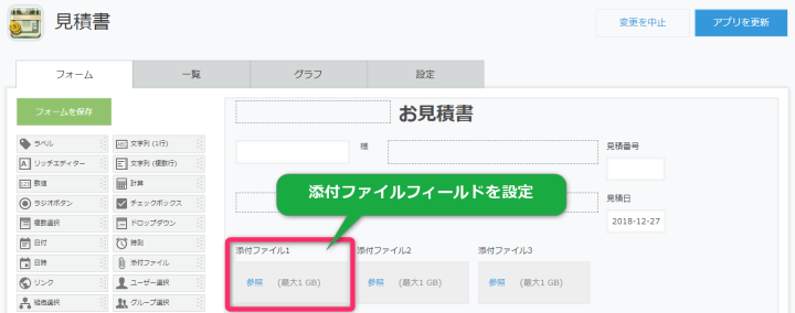 - 「ジョイゾーのPDFプレビュープラグイン」に対応する添付ファイルフィールドをkintoneアプリに準備してください。