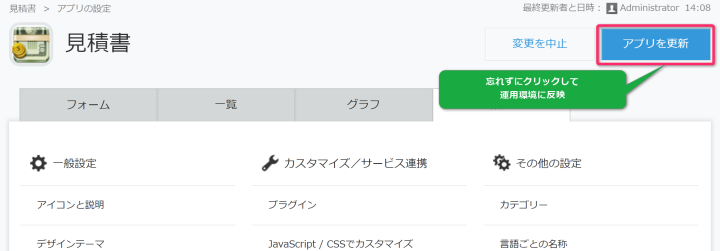 - プラグインの設定が完了したら、忘れずにアプリの設定を運用環境に適用します。