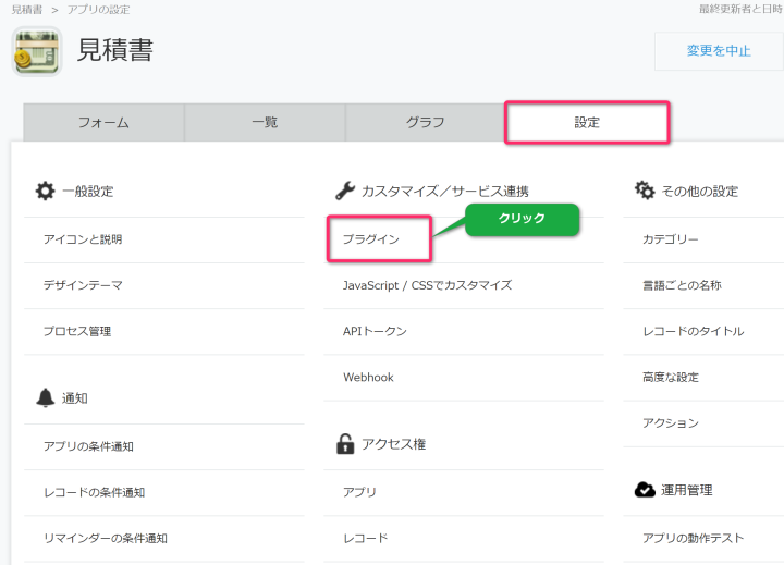 - プラグインを設定するアプリの[アプリの設定を変更する]をクリックします。