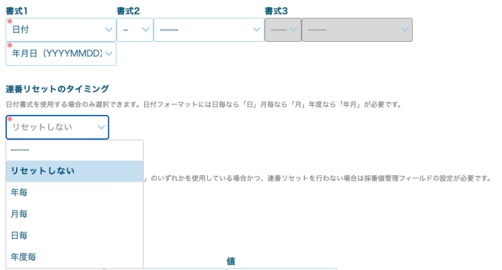 先ほどご紹介した「日付あり・リセットなし」などの設定で、「採番値管理フィールド」を使用している場合です。