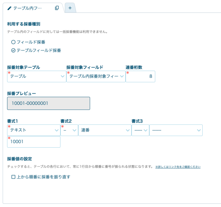 また設定画面にあるように、採番値の設定でテーブルの上から順番に採番を振り直す設定もすることが可能です。