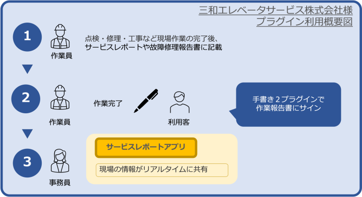 点検・修理・工事など現場作業の完了後、「サービスレポート」や「故障修理報告書」といった書類には紙の帳票を利用していたが、紛失してしまったり現場と事務所の間でリアルタイムな情報共有が行いづらいということもあり、kintoneを利用した電子化に取り組むことになった。そこでユーザからの確認も電子的に残すため手書き2プラグインを導入することになった。