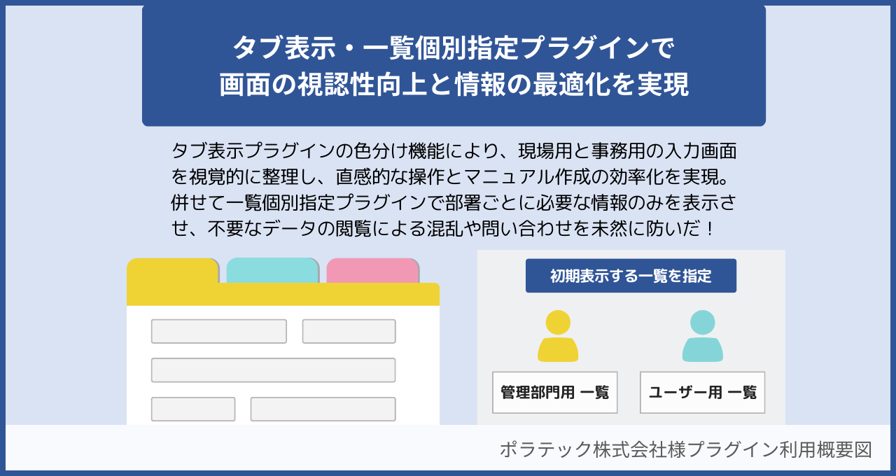 タブ表示プラグインと一覧個別指定プラグインを組み合わせることで、これらの項目を権限設定によって非表示にし、ユーザーの画面をシンプルに保つことで、ユーザーは自身の業務に必要な情報だけに集中できるようになりました。