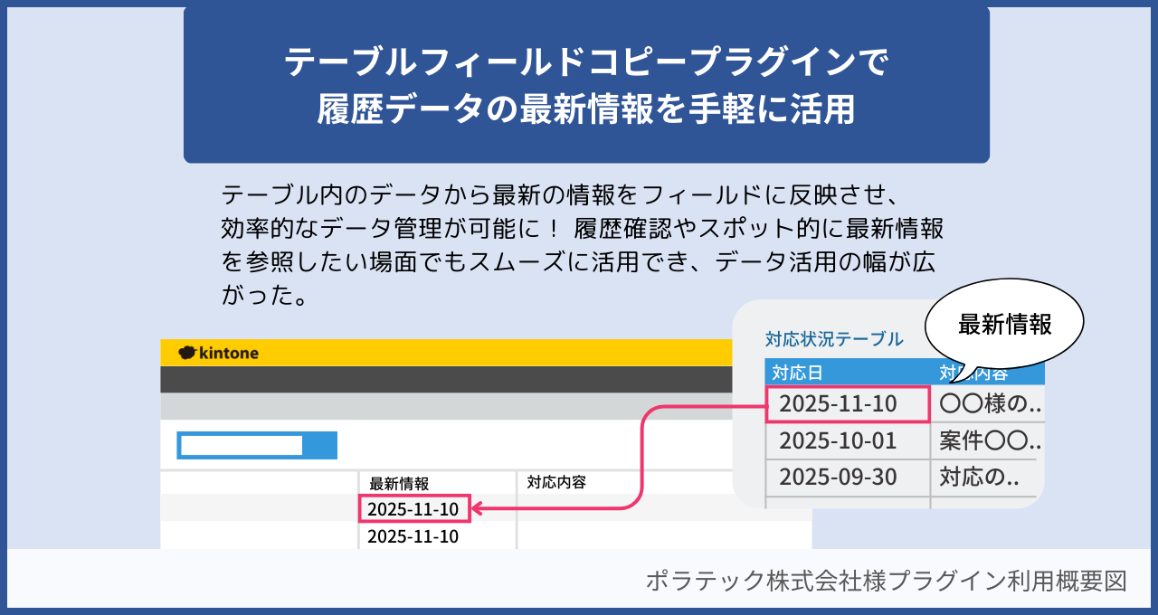 kintoneのレコード内に履歴が残るテーブルデータがあるアプリにおいて、テーブル内の最新の情報だけを抜き出して、レコードのメインのフィールドに表示させたいという目的がありました。