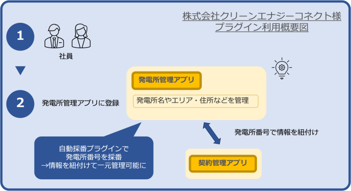 自動採番プラグインの導入により、発電所情報を登録した時点で発電所番号が自動付与される仕組みを構築。