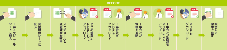 取引先の工事業者への発注は、共有ストレージに顧客情報をアップロードし、弊社と工事業者が案件の進捗に応じて情報を追記するという形で管理していました。その行程を、毎日必ず朝晩と行わなくてはならず、大変な労力を必要としていました。