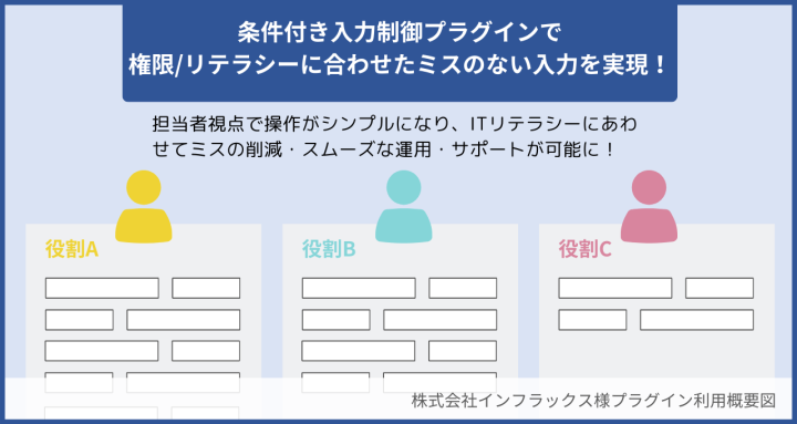 プラグインの導入により、担当者視点での操作のシンプル化が実現した。一人ひとりのアクションに適応したフィールド制御を行うことで、ミスの削減に効果を発揮した。ITリテラシーにあわせて操作できる範囲を制限することで、運用のスムーズな進行のサポートができた。