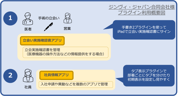 手術に立ち会い、医療機器の操作方法などの情報提供をする場合、立合実施確認書にサインをする場面があり、元々別のツールを使用していた。kintoneでの管理に移行する際、kintone標準機能では手書きサインはできないため、手書き2プラグインを導入した。