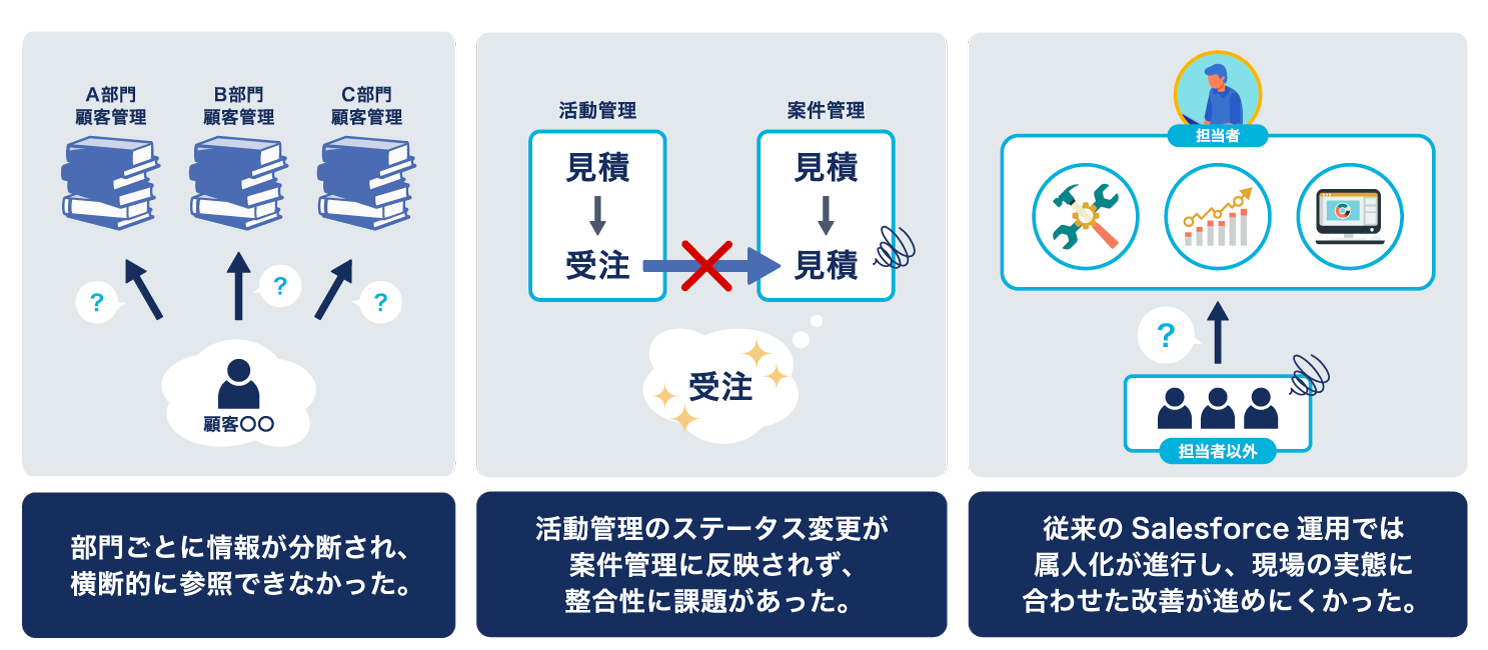 ・部門ごとに顧客・案件・活動情報が分断され、横断的に参照できないことで営業活動停滞の要因となっていた。