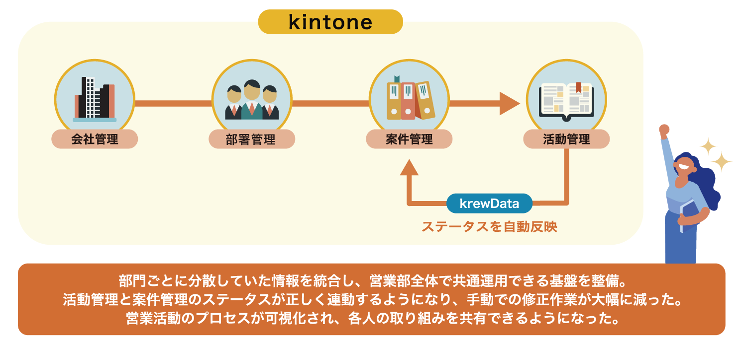 また、活動管理の可視化によって、営業活動そのものの理解や評価もしやすくなり、部門間のコミュニケーションにも良い影響が生まれています。アプリ間の連携には krewData を活用したことで、統合した顧客情報と案件・活動情報が整合した形で扱えるようになった点も運用面での安定につながっています。