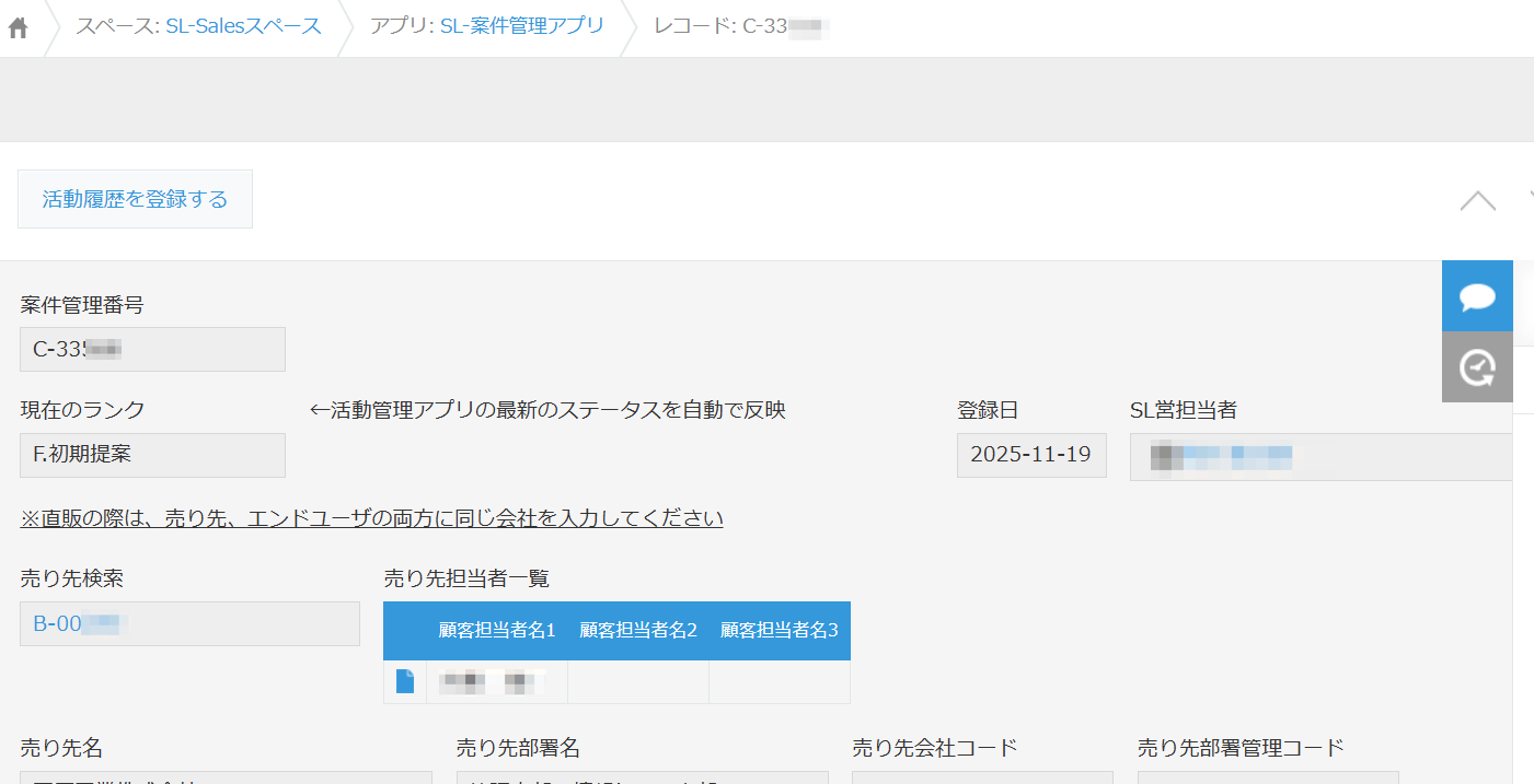 また、以前、導入時に設定されていたJavascriptの不具合により、活動管理アプリで更新したステータスが案件管理側に反映されないことが長く課題となっていましたが、連携部分の見直しにより改善され、情報の整合性が保たれるようになりました。今回の開発では、アプリ間のデータ連携にkrewDataを用いて必要な情報を確実に反映させる仕組みを構築しており、管理者側の確認や手動修正の工数が大幅に減っています。