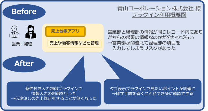 営業部と経理部の情報が同じレコード内にあるため、営業部が間違えて経理部の項目を入力してしまうリスクがあった。また、レコード内を自由に編集できるため、売上金額の修正が伝達なく行われることもあり、修正箇所を探すのに手間がかかっていたため、条件付き入力制御プラグインを導入した。