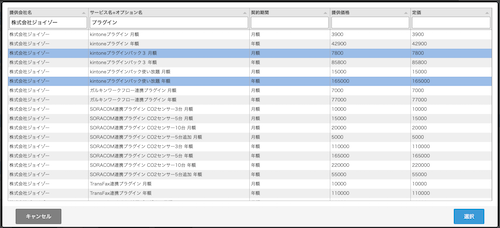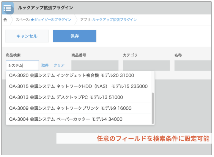 明細テーブルで商品マスタから一行ずつ商品をルックアップするのが面倒。。このプラグインを利用すると商品マスタなどマスタアプリから簡単に商品を検索し、まとめて明細テーブルに登録することができます。ジョイゾー一押しのプラグイン!
