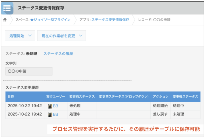 プロセスのステータス変更履歴をレコード内のフィールドに自動的に保存。他のプラグインを組み合わせることで条件付きの入力制御やプロセスごとの集計なども可能になります。