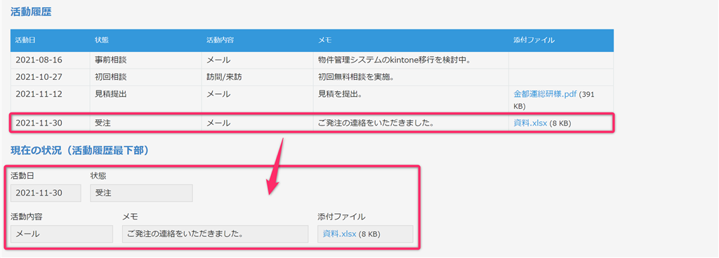 そこでテーブル外に最新状態を保存するフィールドを設置し、テーブルフィールドコピープラグインを利用すると、テーブルの一番下にある最新の情報をテーブル外のフィールドにコピーすることができ、コピーされたテーブル外のフィールドを絞り込み対象とすることで希望通りの検索結果を得ることができます。