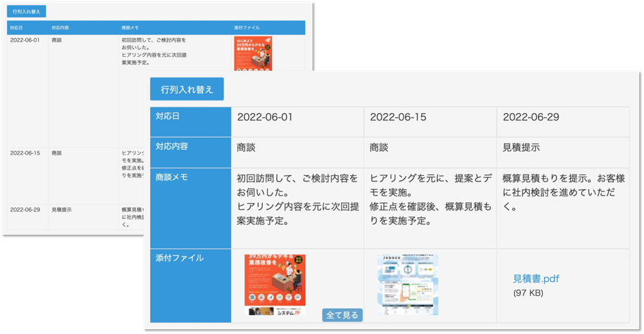 テーブルの左上に表示される「行列入れ替え」ボタンをクリックすることで、簡単に行表示/列表示の入れ替えができるので、その時々で見やすい表示に変えることができます。