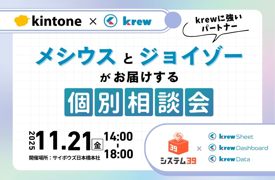 そんなお悩みをお持ちの方に向けて、krewの開発元であるメシウス株式会社の社員と、kintoneを活用したシステム開発やkrewシリーズを始めとした連携サービスの設定・設計に特化した業務改善支援に豊富な実績を持つパートナー企業ジョイゾーが共催する特別相談会を開催します!